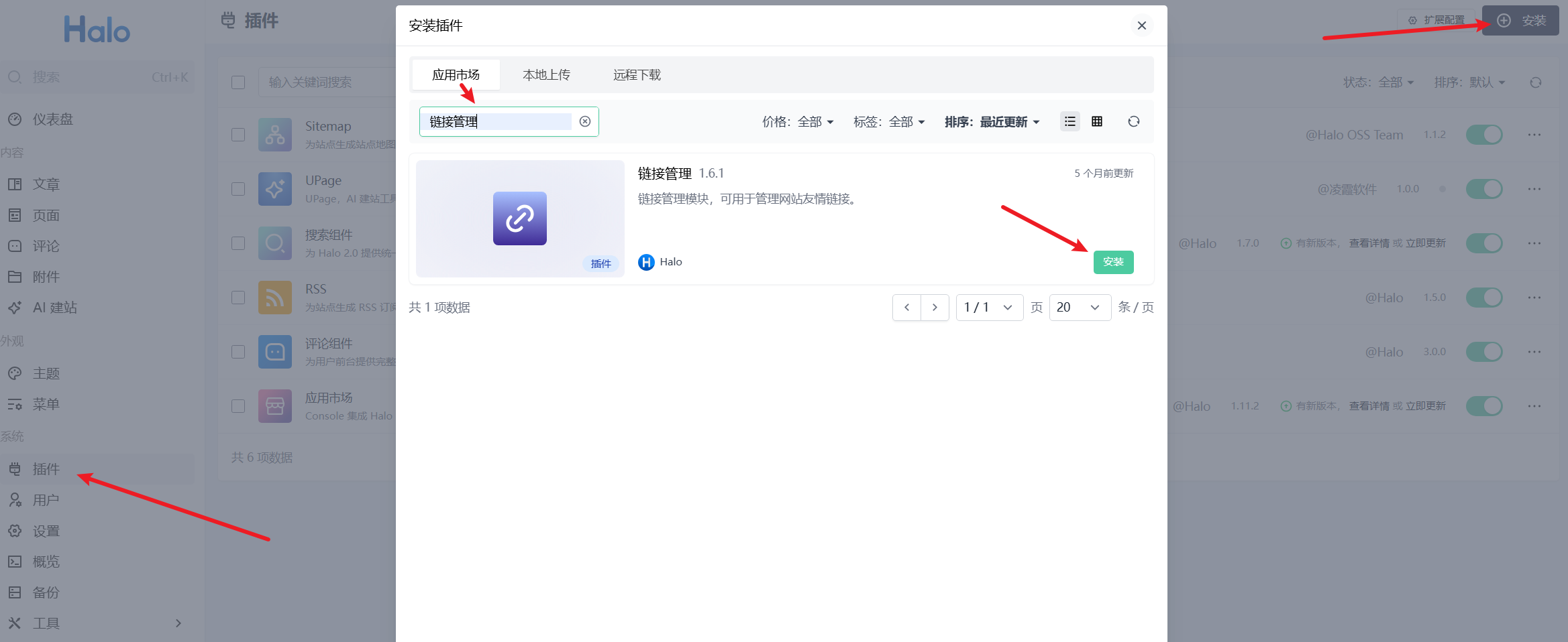 随后我们来到插件,选择安装插件,搜索链接管理点击安装,安装后插件属于关闭状态需要手动开启。