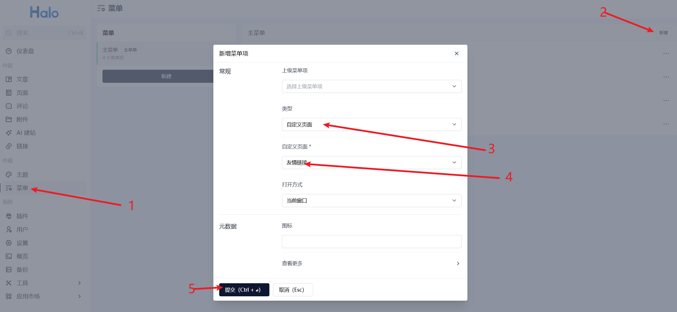 随后咱们还需要在菜单里添加,首先点击菜单,点击新建,类型选择自定义页面,选择友情链接,点击提交。