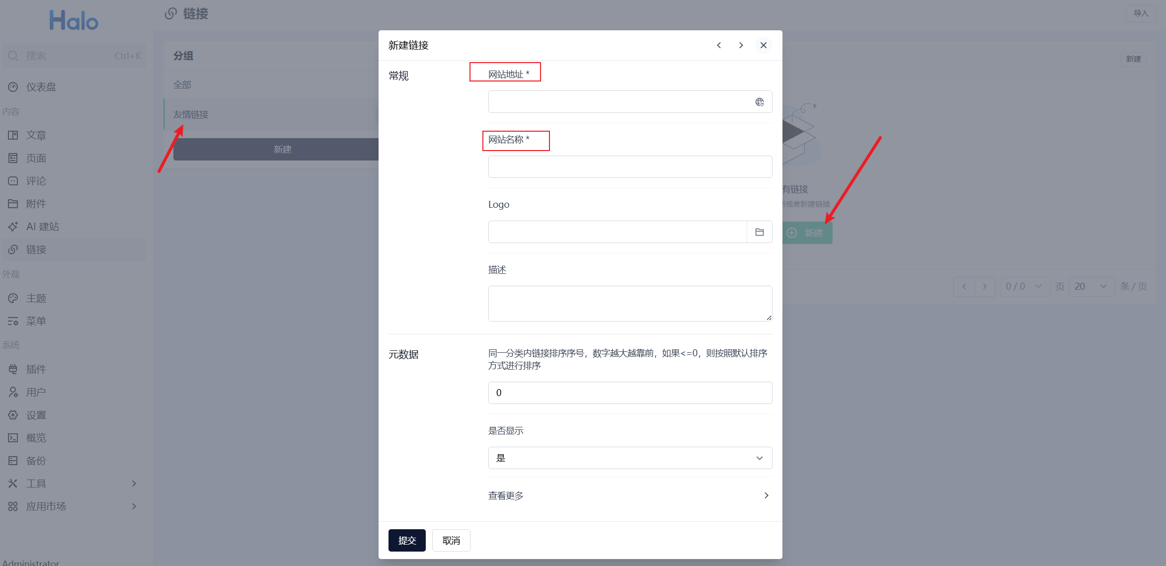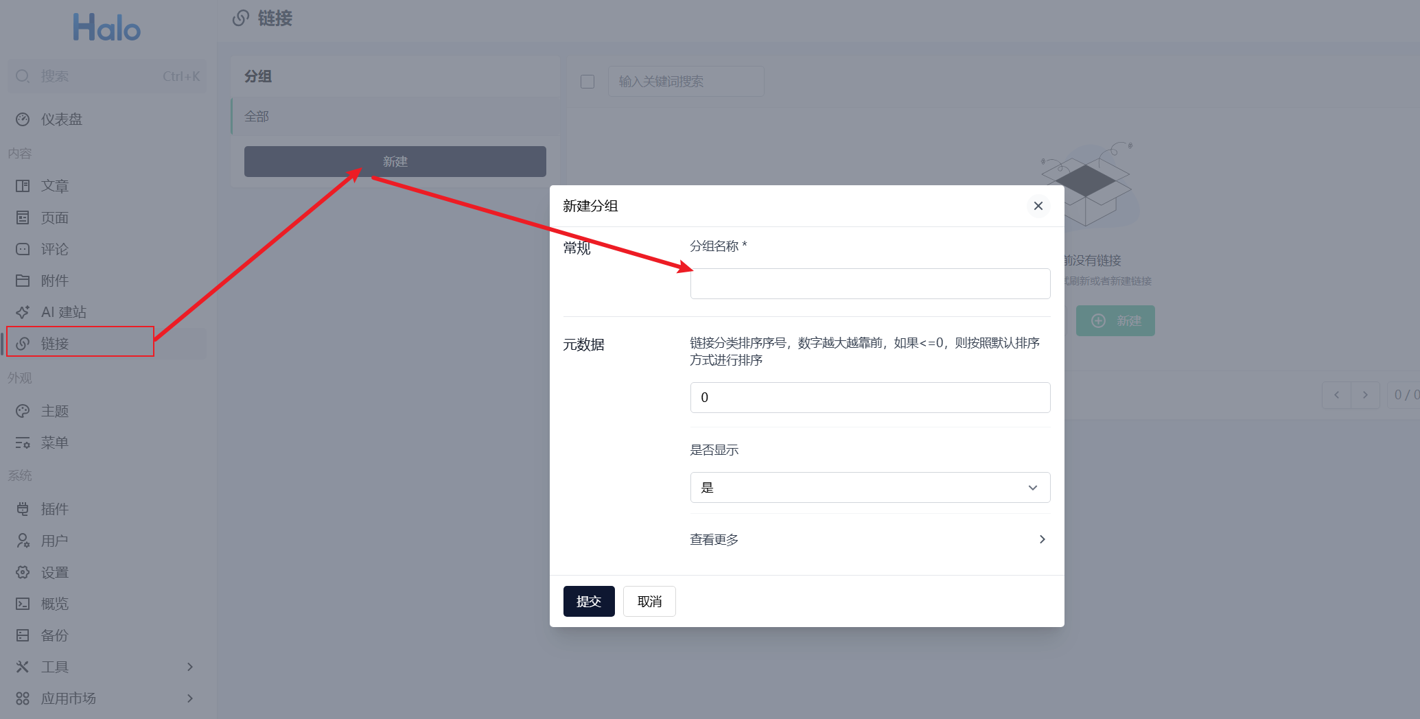开启插件后左边会多一个链接的功能,点击新建分组,分组名称改为友情链接,完成后点击提交。