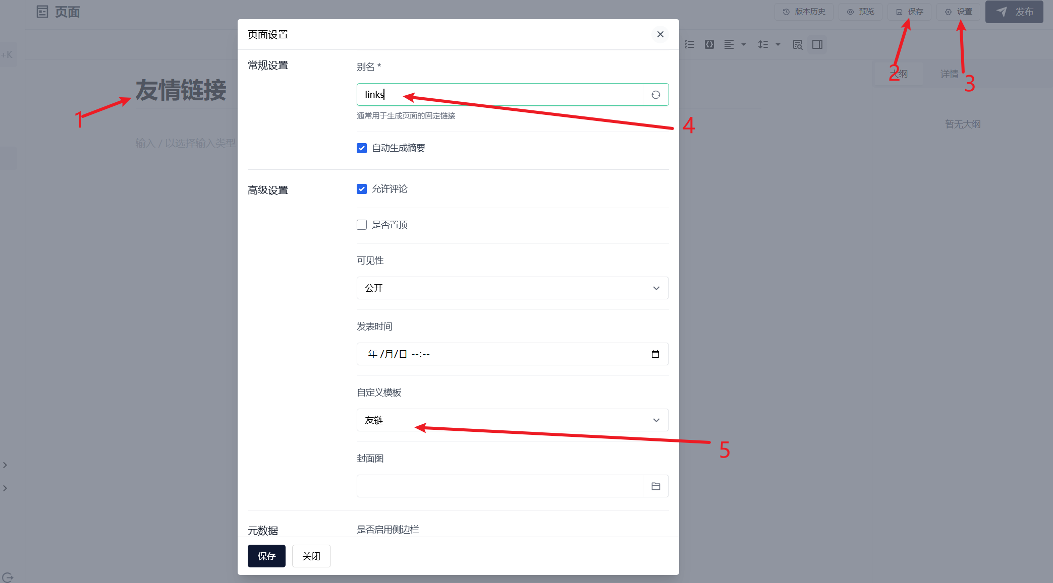 随后启用主题后,我们需要创建一个自定义页面,创建页面后,将标题命名为友情链接,点击保存后会增加一个设置选项,随后我们将别名改为links,随后把下面的自定义模板改为友链,注意只有支持友链的主题才有友链模板,随后点击保存然后点击发布。