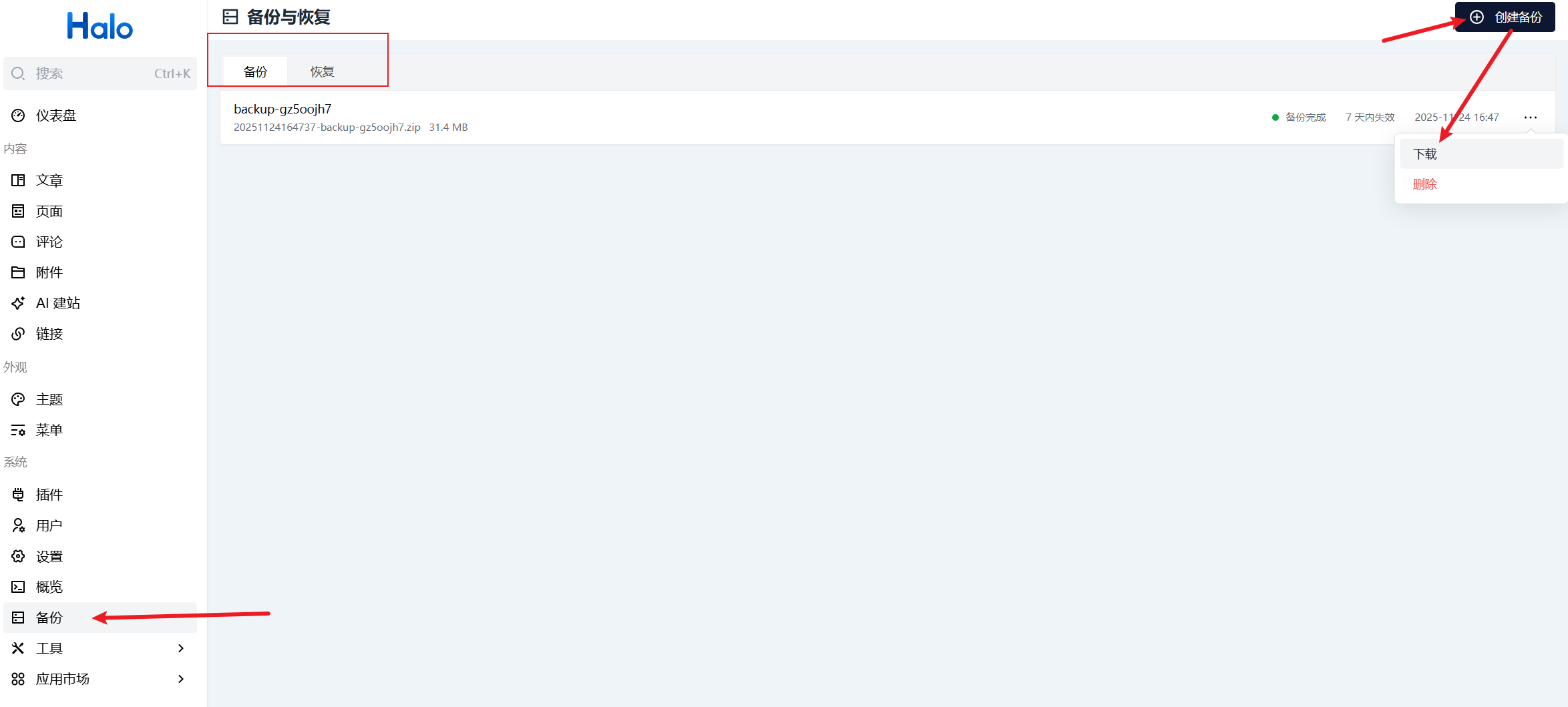 首先我们点击备份,点击创建备份,创建完成后点击下载,保存好即可,当网站崩溃了重建后,点击恢复,并上传当时备份的文件即可。Halo插件有个定时备份的插件,大家可以尝试使用一下。