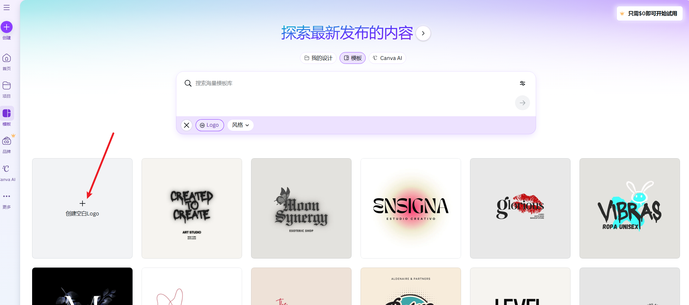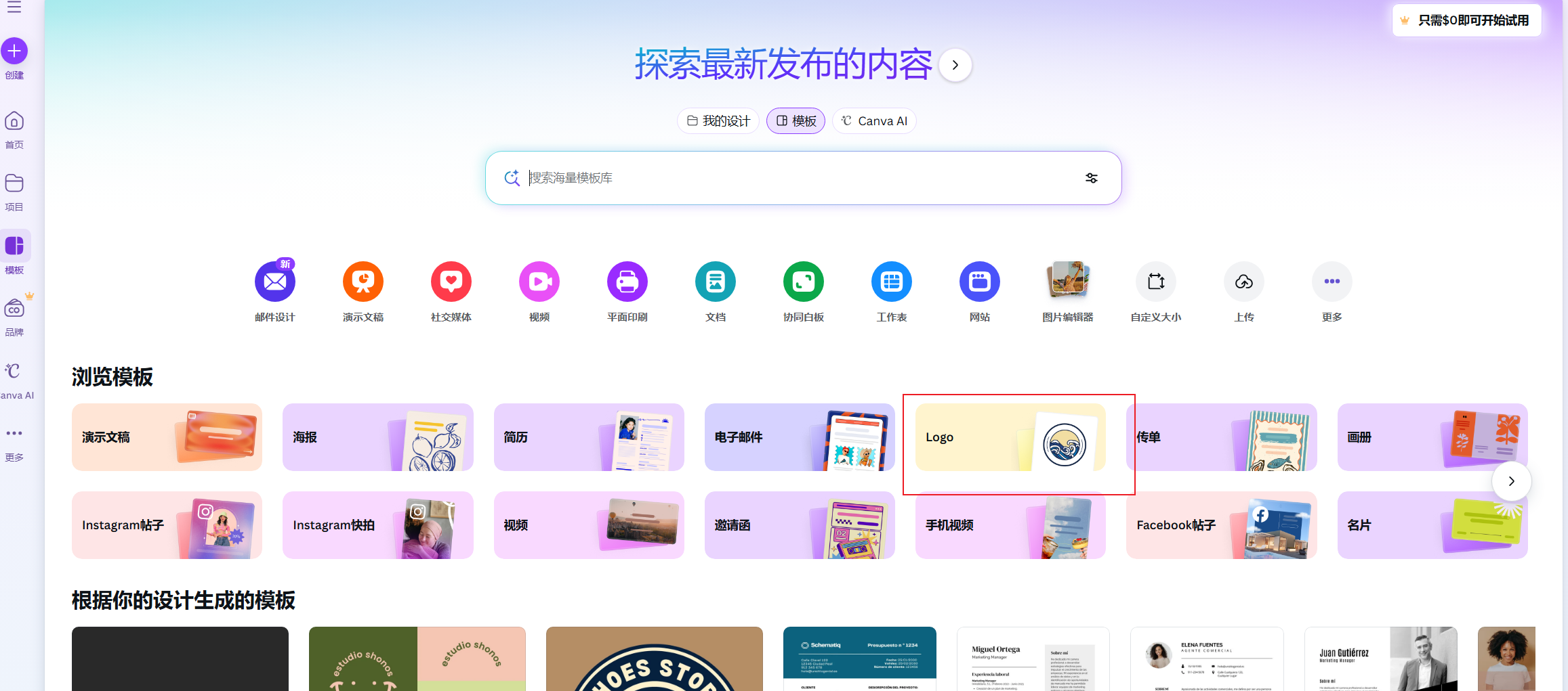 首先我们进入canva官网,自己进行注册登录后l来到主页,选择logo设计。