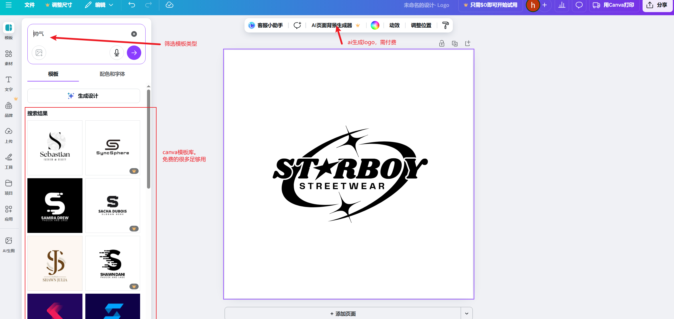 进入设计页面,左边的模板库有很多的模板供我们使用,左上角可以搜索想要模板的类型,也有ai设计的功能,但需要收费。
