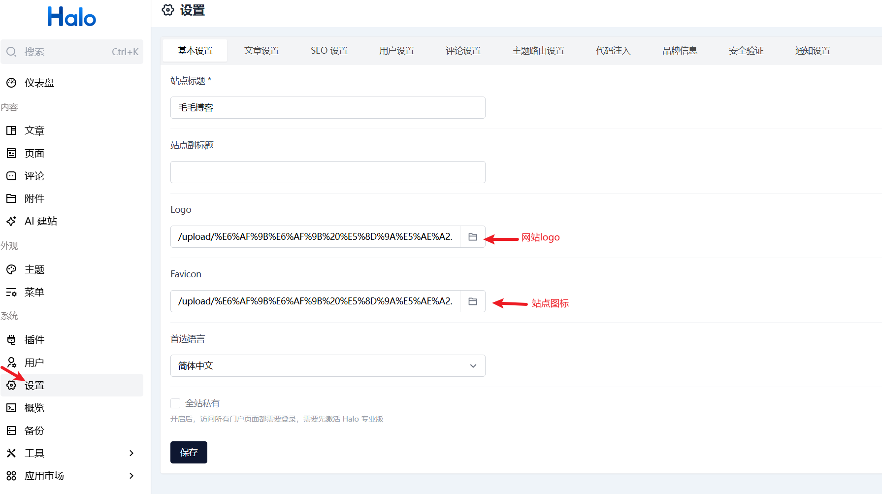 首先我们登录网站的halo后台,点击设置,上传刚刚下载好的logo,再上传Favicon站点图标,点击保存。