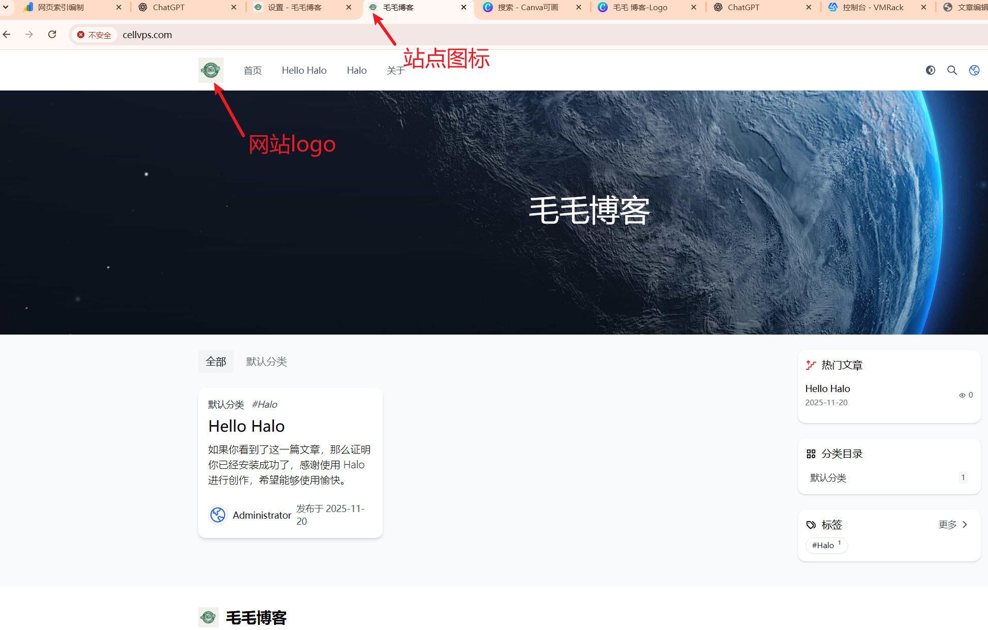 回到我们的网站刷新一下,logo和站点图标就显示出来了,这里博主只是做个示范,设计的logo比较丑,大家可以自己慢慢设计美化。