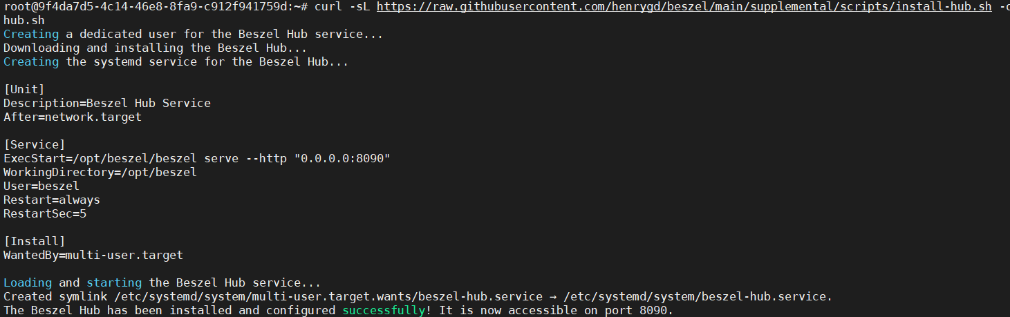 curl -sL https://raw.githubusercontent.com/henrygd/beszel/main/supplemental/scripts/install-hub.sh -o install-hub.sh && chmod +x install-hub.sh && ./install-hub.sh安装速度很快,如图则是已经安装好